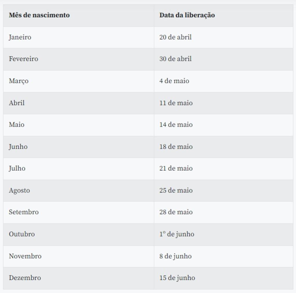 Pelo calendário divulgado em março, a liberação dos recursos segue cronograma baseado no mês de nascimento do trabalhador. O dinheiro será liberado em etapas até 15 de junho, quando recebem os nascidos em dezembro.