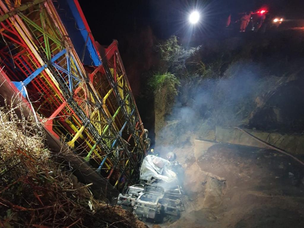 Os bombeiros depararam com o caminhão que puxava uma "carreta trenzinho". Por motivos desconhecidos, o condutor perdeu o controle, saiu da pista e caiu em um buraco de aproximadamente 15 metros de profundidade. Com o impacto, o cavalinho da carreta veio a se incendiar.