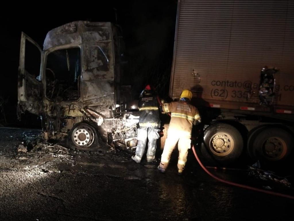 Com o impacto, o caminhão trator pegou fogo. O motorista saiu a tempo sem ferimentos.