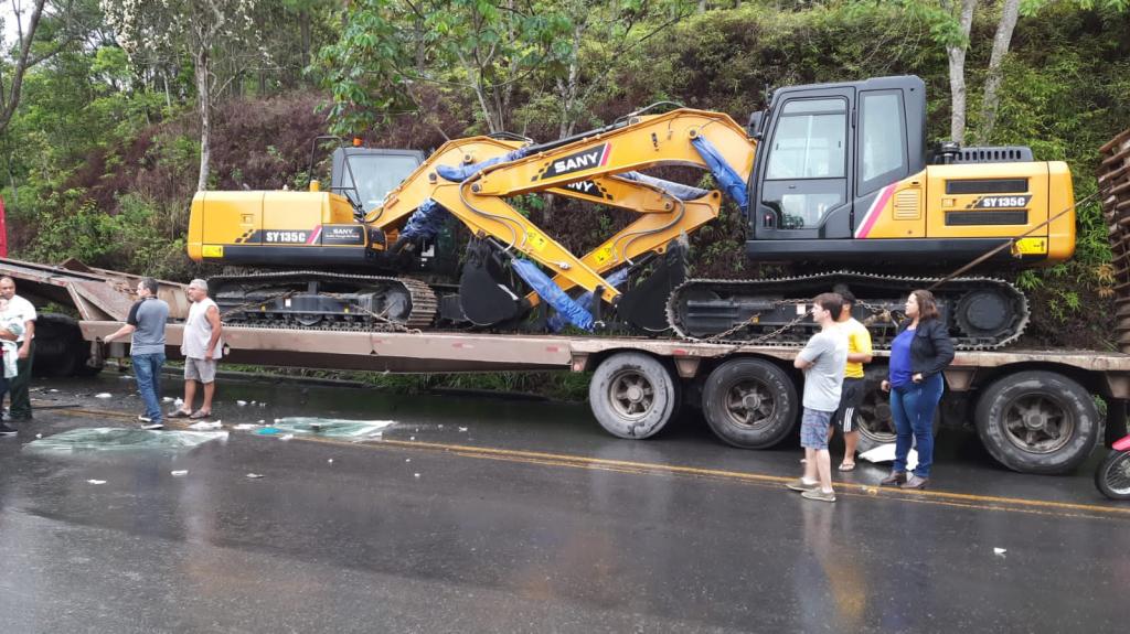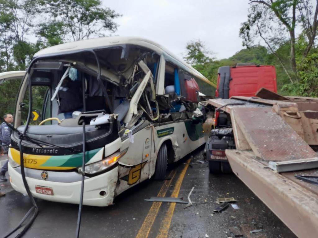 Chovia na hora do acidente, coletivo invadiu a contramão em uma curva e atingiu caminhão e carreta que passavam com uma máquina