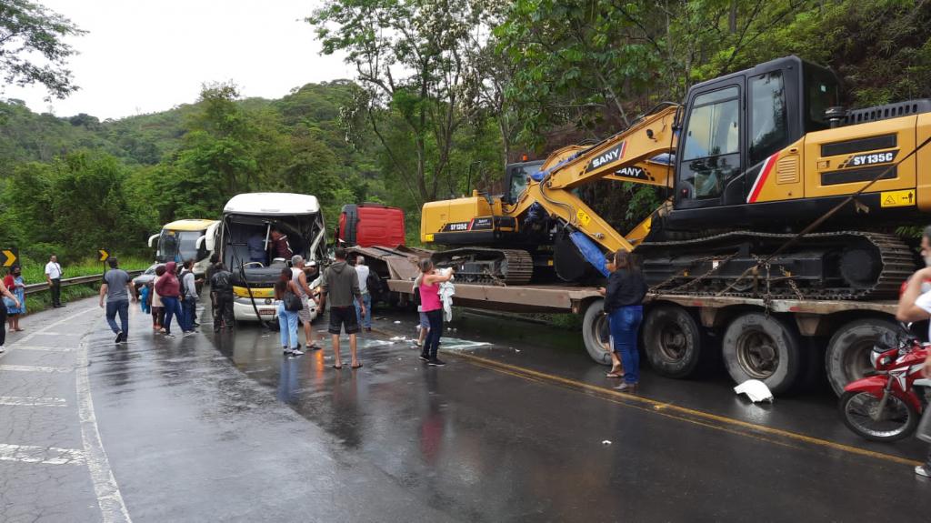 Chovia na hora do acidente, coletivo invadiu a contramão em uma curva e atingiu caminhão e carreta que passavam com uma máquina A maioria dos passageiros de um ônibus que trafegava de Timóteo para Vitória (ES) sem ferimentos de um grave acidente na manhã desta quinta-feira (23).