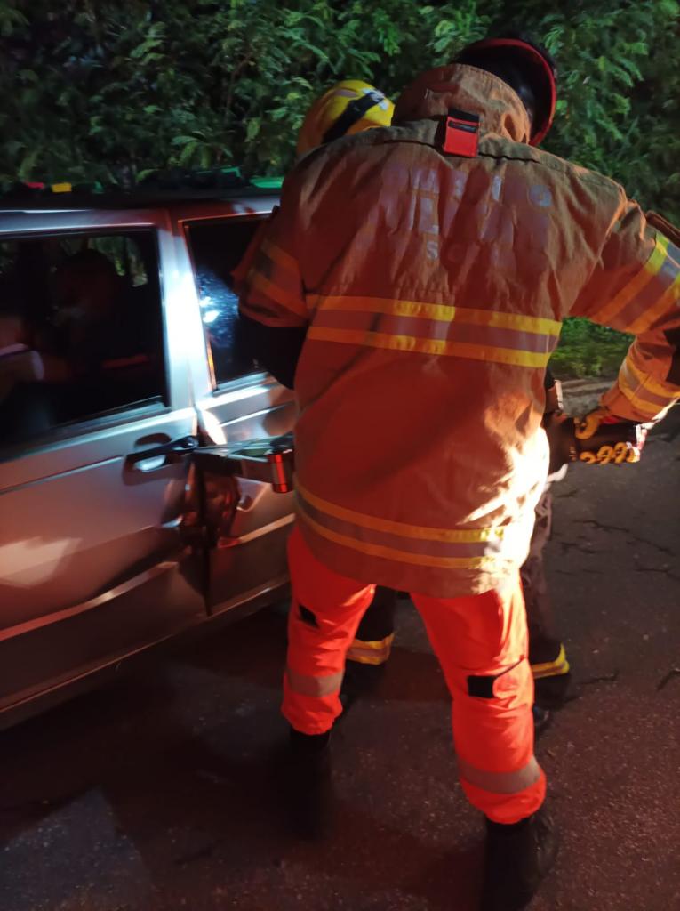 Os bombeiros precisaram usar um alargador para abrir a porta do Fiat Uno e retirar o motorista de dentro do carro