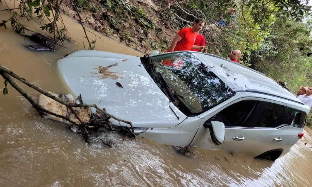 Motorista tentou atravessar um córrego, que estava cheio por causa da chuva intensa, mas veículo foi arrastado, uma mulher e uma criança morreram o motorista e um adolescente sobreviveram