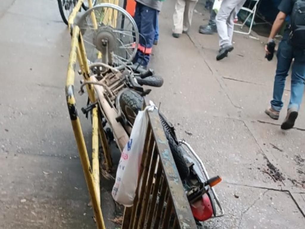 O motociclista perdeu o controle e caiu no asfalto, mas a moto seguiu sozinha e caiu no meio da pista de pedestres do mergulhão e atingiu a proteção central, que separa a calçada de pedestres e a pista de bicicletas.