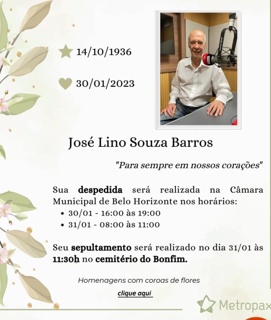 Ícone do rádio brasileiro, José Lino Souza Barros iniciou sua carreira na Itatiaia no dia 24 de março de 1957 O radialista José Lino Souza Barros, de 86 anos, morreu na manhã desta segunda-feira, em Belo Horizonte. O corpo de José Lino, que por muitos anos apresentou o programa Rádio Vivo”, será velado na Câmara Municipal, no bairro Santa Efigênia, na região Leste de Belo Horizonte, nesta segunda (30) e terça-feira (31), quando será sepultado. A informação é da Rádio Itatiaia.