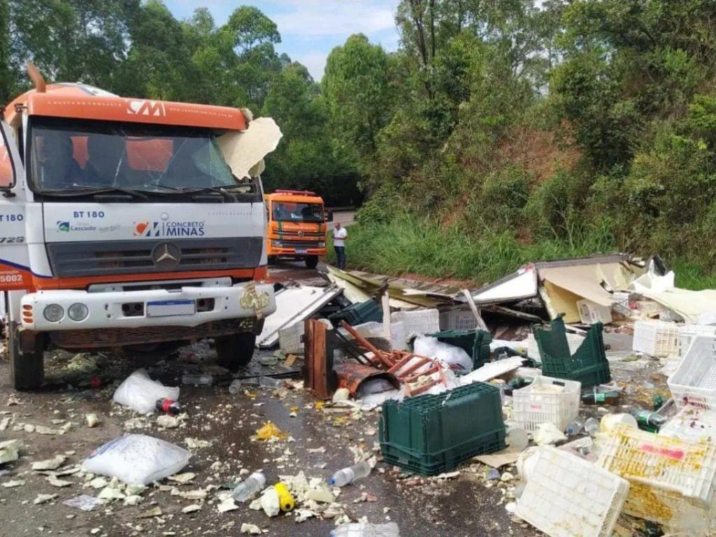 Uma pessoa morreu e outras duas ficaram feridas em um acidente registrado na manhã deste sábado (15), na BR-356, em Itabirito. Dois caminhões, um que transportava alimentos e outro que levava uma carga de concreto, colidiram.