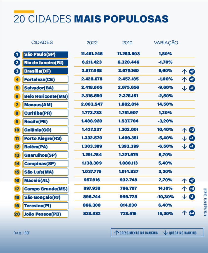 Por Léo Rodrigues - Repórter da Agência BrasilA divulgação dos primeiros dados do Censo 2022 nesta semana pelo Instituto Brasileiro de Geografia e Estatística (IBGE) revelou que as cidades de Salvador, Natal, Belém e Porto Alegre tiveram reduções populacionais acima de 5% nos últimos 12 anos. Embora com percentuais menores, o número de moradores em Belo Horizonte, Recife, Fortaleza e Rio de Janeiro também encolheu no período. Ao mesmo tempo, foram registrados aumentos tímidos, abaixo de 2%, em São Paulo e Curitiba, sinalizando uma redução no ritmo do crescimento populacional.