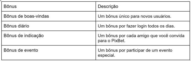 O PixBet oferece diversos bônus aos seus usuários como forma de recompensá-los por sua atividade e lealdade. Aqui está uma tabela de PixBet promoção que mostra os diferentes tipos de bônus: