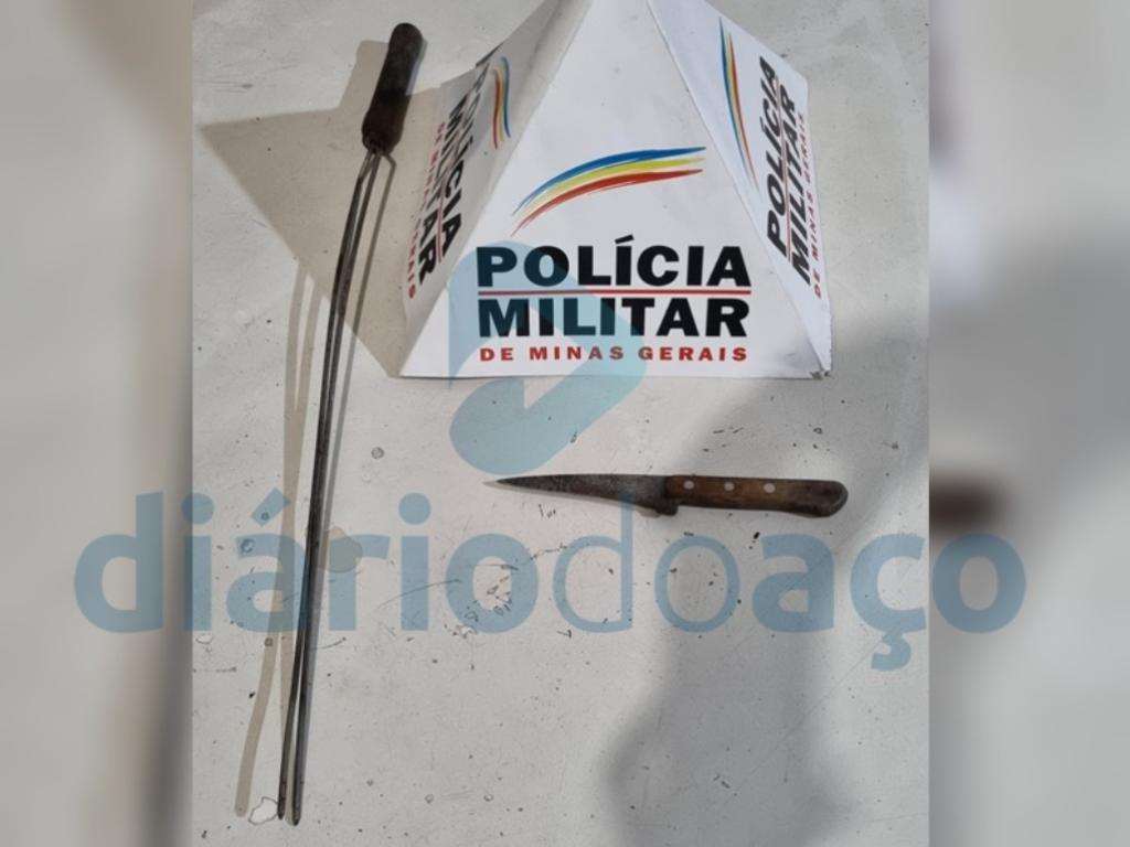 A faca de cozinha e o espeto de churrasco que foram usados durante as ameaçasNegociação demorada, tiros de balas de borracha e até o uso de pistola elétrica foram os meios usados por policiais militares para resolver uma situação tensa na tarde de domingo (20) na rua Quartzo, no bairro Iguaçu, em Ipatinga. Um homem de 41 anos foi preso acusado de agredir e ainda manter a mulher de 44 anos em cárcere privado.