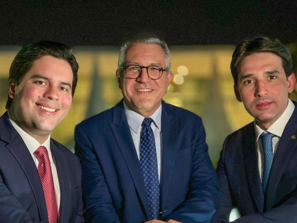 Novos ministros André Fufuca (esquerda) e Silvio Costa Filho (direita) com o ministro Alexandre Padilha (centro)