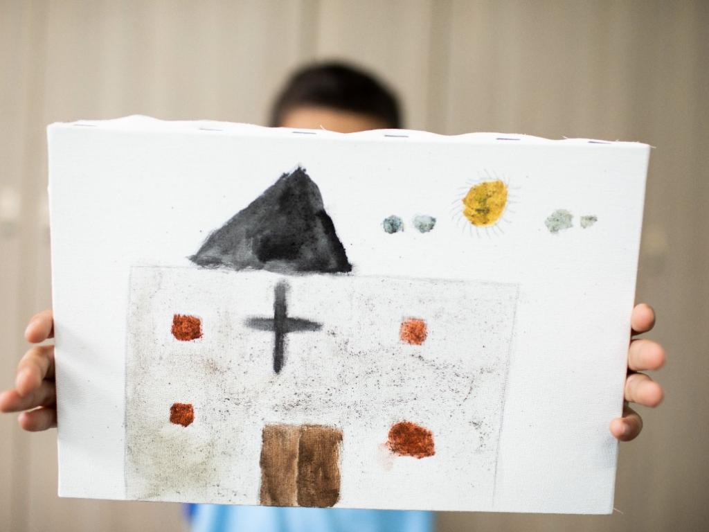 O aluno Pedro Lucas Arruda Santos, de 9 anos, confirma o que aprendeu com a artista. Aprendemos na oficina que coisas que iam ser descartadas na natureza podem ser utilizadas para virar algo novo e bonito”, conta o estudante, que caprichou na escolha das cores e pintou a igreja que frequenta com a família.