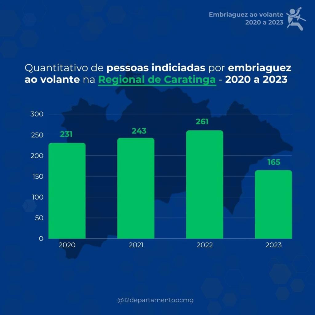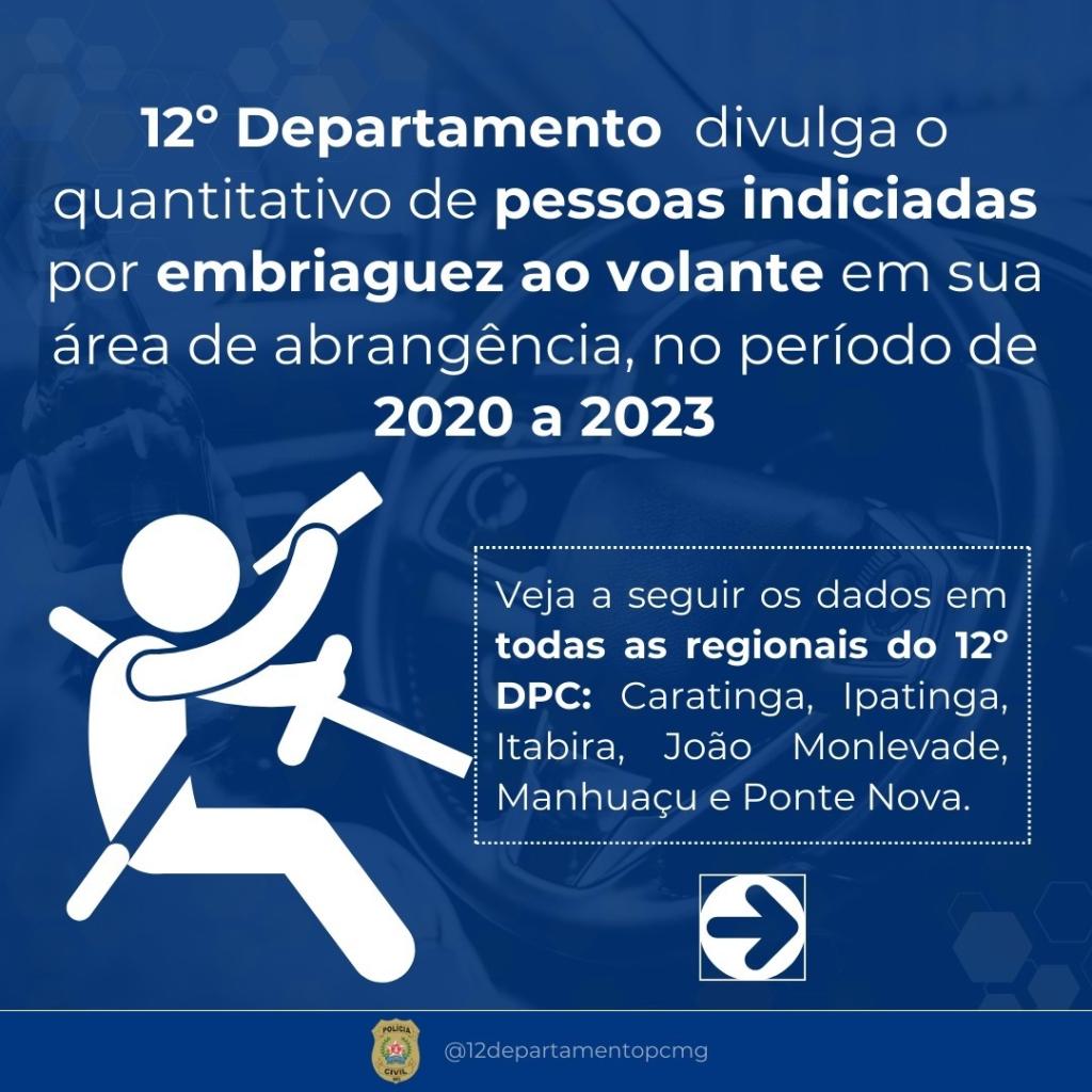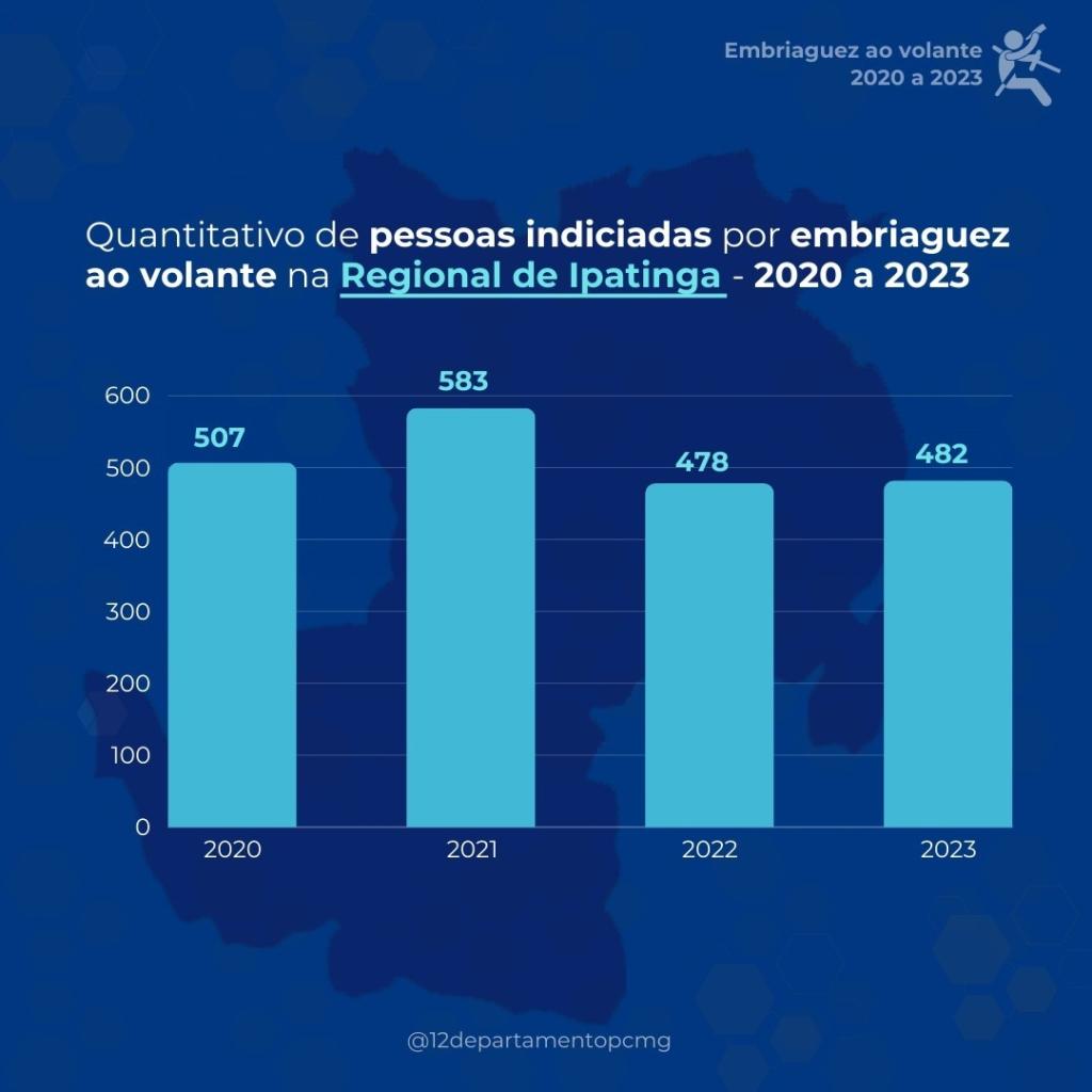 Estudos realizados pelo 12º Departamento de Polícia de Ipatinga apontam que, no período de 2020 a 2023, 5.616 pessoas foram indiciadas em toda a região pelo crime de embriaguez ao volante, abrangendo as regionais de Ipatinga, Caratinga, Itabira, João Monlevade, Ponte Nova e Manhuaçu. Nos últimos quatros anos, a Regional de Ipatinga somou 2.050 casos.Segundo o chefe do 12º Departamento, delegado Gilmaro Alves Ferreira, considerando todo o departamento, houve uma queda de quase 10%, devido à intensificação das blitz realizadas pela Polícia Militar e Rodoviária Federal, somadas às campanhas de conscientização e à rapidez na conclusão dos Inquéritos Policiais por parte da Polícia Civil.