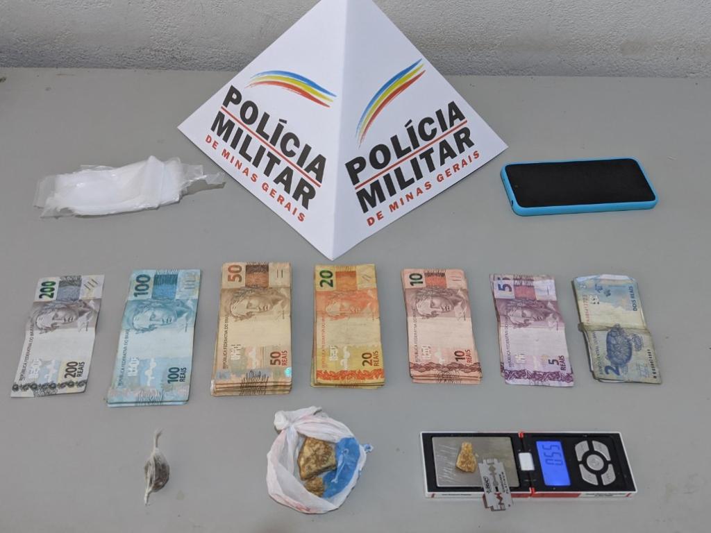 Com reforço policial de São José do Goiabal, a equipe de Dionísio organizou a abordagem ao local denunciando. No imóvel foi detido W.J.C., de 20 anos e recolhidas, no local pedras de crack fracionadas para o consumo (mais de 80 pedras), uma porção de maconha e R$ 2.423 em dinheiro foram encontrados em uma gaveta tipo "caixa" de loja. Os policiais recolheram também outros objetos relacionados à mercancia de entorpecentes, dentre eles, sacolés, lâmina e balança de precisão.