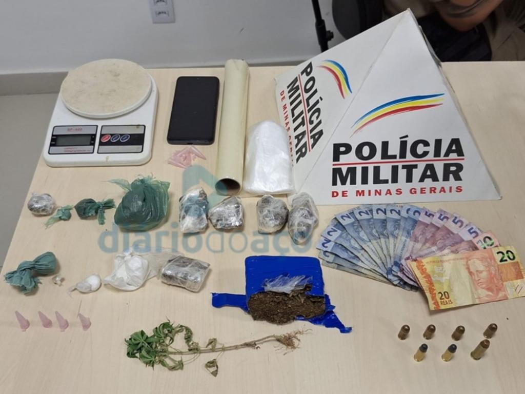 As porções de drogas, balança, munição, celular e outros objetos recolhidos durante a abordagem policialApós abordagem ao suspeito e buscas no local, foram encontradas na casa onde mora o jovem porções de drogas: um tablete de maconha, nove porções da mesma droga, duas de cocaína, quatro pinos com cocaína, duas porções de crack e um pé de cannabis sativa, a planta da maconha.