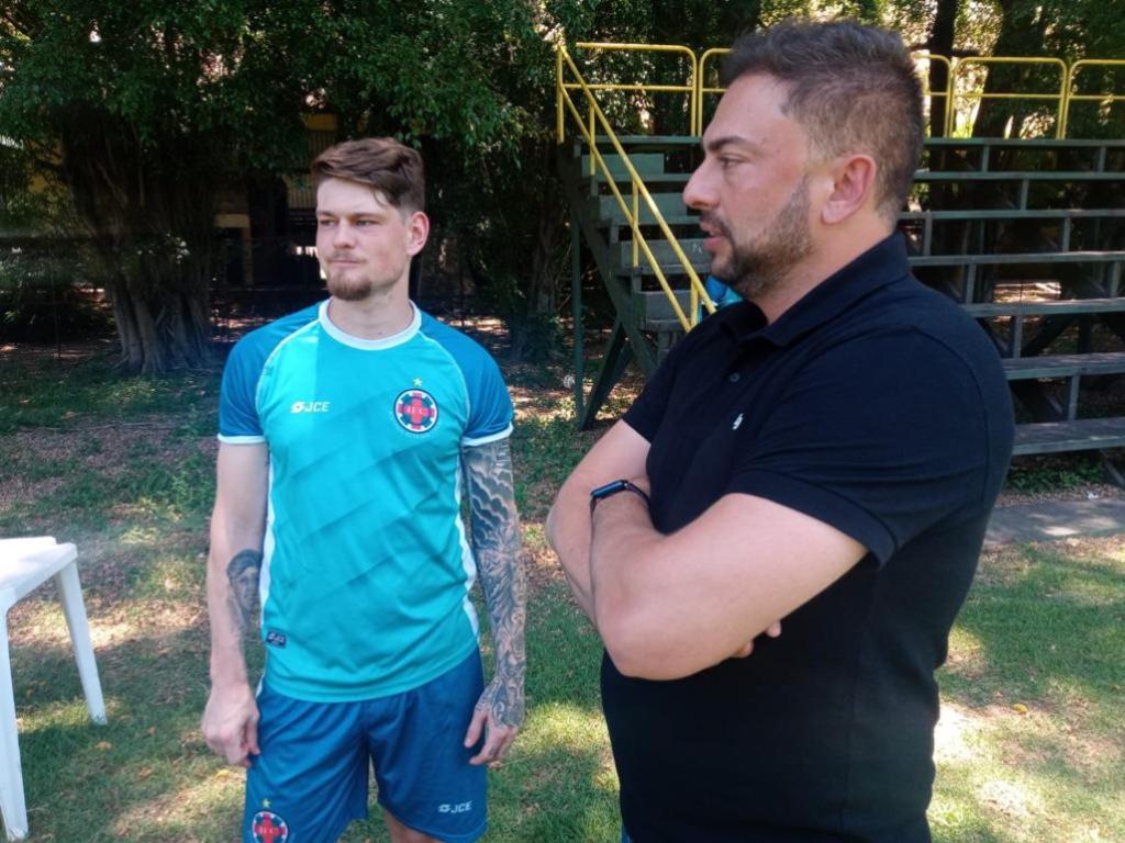 O meia Luizinho, na foto ao lado do presidente Nicanor Pires, será um dos titulares do Ipatinga na temporadaOs jogadores do Ipatinga treinaram na manhã desta segunda-feira (15) sob a orientação do treinador Carlos Pimentel. Na manhã desta terça-feira (16), nova atividade a partir de 9h no campo principal do centro de treinamentos do bairro Cariru, a última antes do jogo-treino do dia seguinte, às 10h, em Tombos, contra o Tombense.