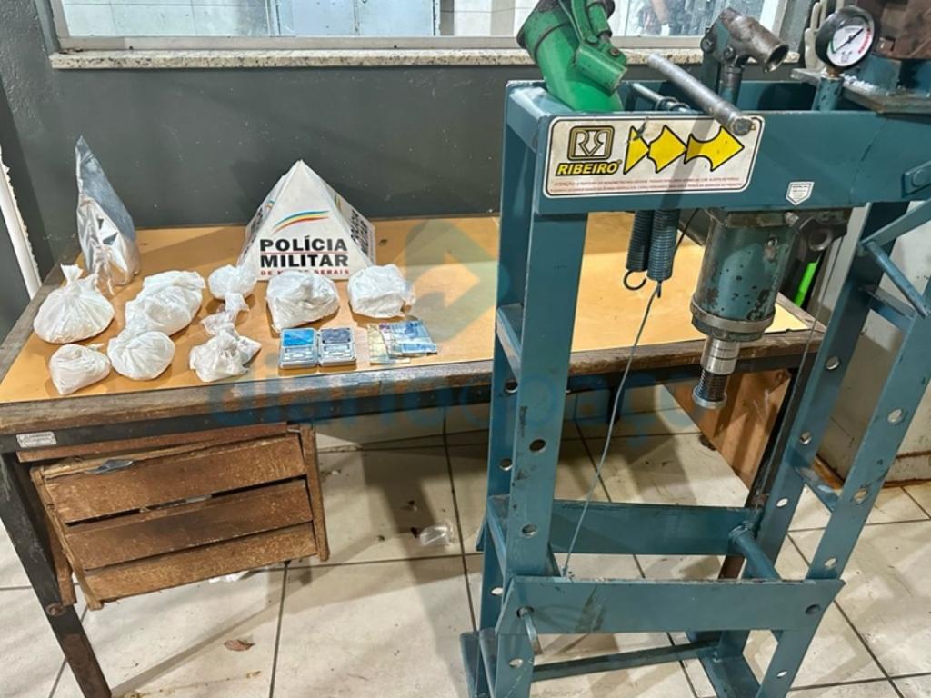 Além de cocaína, os policiais localizaram uma prensa hidráulica na residência no Córrego NovoAs guarnições cercaram a casa e avistaram os dois suspeitos chegando em uma motocicleta. Momentos depois, outra motocicleta parou no portão e recebeu uma sacola dentro da garagem, saindo em seguida em alta velocidade. Os militares tentaram abordar essa moto, mas a perderam de vista.