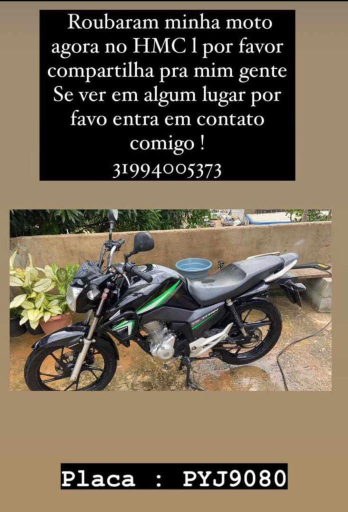Um ladrão levou, na noite de segunda-feira (4), a Honda CG Titan 160 placa PYJ-9080, de Santana do Paraíso. A proprietária, J.V. explicou ao Diário do Aço que chegou para trabalhar no Hospital Márcio Cunha I, na tarde de segunda-feira, estacionou o veículo na avenida Engenheiro Kiyoshi Tsunawaki e, ao sair, por volta de 21h40, descobriu que a moto havia sido levada pelos ladrões.Quem souber do paradeiro da moto deve acionar o telefone 190, da Polícia Militar, ou o disque-denúncia unificado 181. Furtos de veículos, especialmente de motocicletas nas imediações do hospital tem sido frequentes, conforme as reclamações das vítimas.