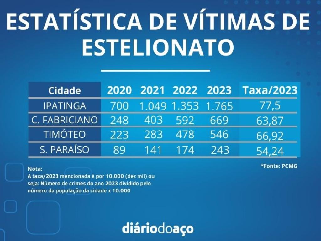 Com a segunda maior população do Vale do Aço, Coronel Fabriciano é o segundo município em que mais houve registros de vítimas de estelionato. Foram 669 pessoas que caíram na lábia” de golpistas, o que significa que 63,87 a cada 10 mil habitantes já tiveram algum prejuízo. Em comparação ao ano de 2022, em que 592 indivíduos sofreram golpes, nota-se um aumento percentual de 13,01%.
