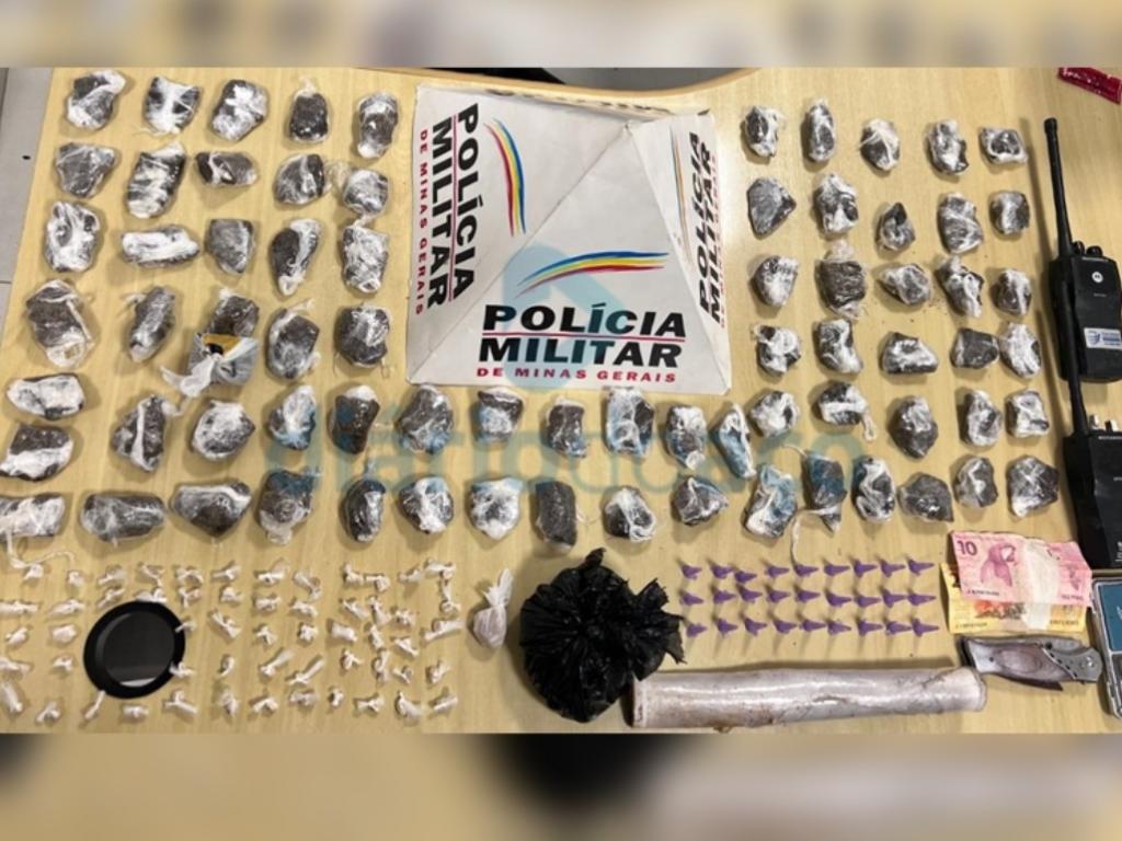 De acordo com fontes ligadas à PM, foi encontrada uma sacola de cor azul com o jovem de 23 anos, contendo 27 pinos de cocaína, 74 porções de maconha, 56 pedras de crack, R$30 em dinheiro, um canivete e uma porção de crack, estando todas essas substâncias embaladas para o comércio.