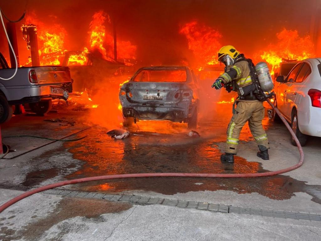 Bombeiro faz combate direto às chamas no interior do centro automotivo no Jardim Panorama