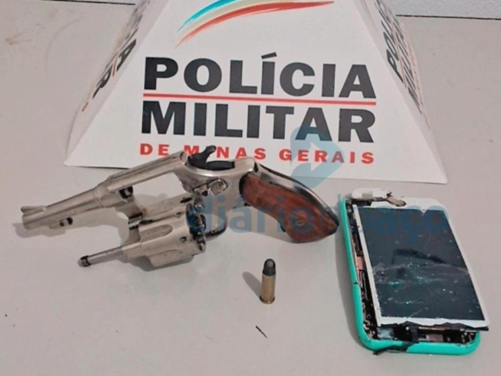 O revólver de calibre 32 foi apreendido junto com o celular, cujo proprietário danificou ao ser abordado pelos PMs