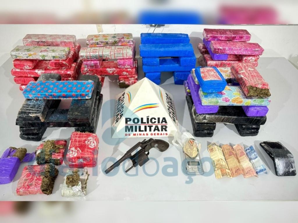 Os militares foram para o local da obra e, em uma busca no imóvel, foram encontrados sacos contendo 68 barras de maconha, pesando quase 70 quilos da droga. Em uma caixa foi recolhido um revólver calibre .38, uma porção de crack e uma balança de precisão.