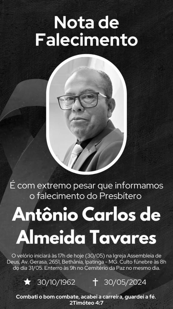 O homem chegou a ser socorrido com vida, mas inconsciente, por uma equipe do Samu, levado para o hospital. Antônio não resistiu aos ferimentos e morreu. O sepultamento está agendado para sábado às 9h, conforme conta no comunicado abaixo.