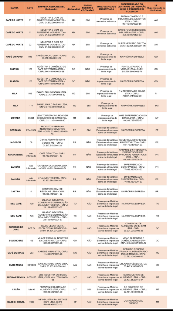 Mapa divulga lista de marcas e lotes de café torrado impróprios para consumo