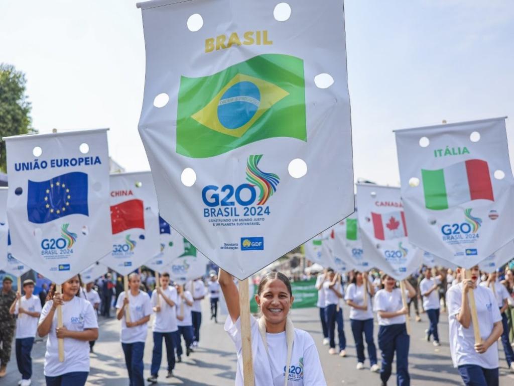 Os jovens ainda desfilaram com as bandeiras de cada uma das 27 unidades da Federação e com placas e bandeiras alusivas ao G20, que em 2024 está sob a presidência do Brasil, trazendo a temática do combate à fome, à pobreza, à desigualdade e com foco na sustentabilidade.