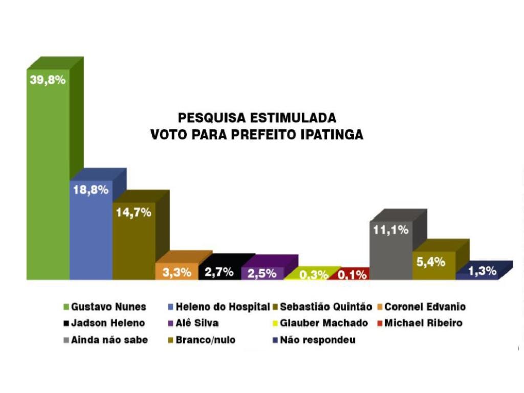 Na pesquisa estimulada, quando os nomes são apresentados aos eleitores, Gustavo Nunes aparece com 39,8% das intenções de voto. Heleno do Hospital (Progressistas) está em segundo, com 18,8%. Sebastião Quintão (MDB) é o terceiro com 14,7%; Coronel Edvanio (Novo) aparece em quarto com 3,3%; Alê Silva (PRD) surge em quinto com 2,5%; Glauber Machado (PSTU) tem 0,3% e Michael Ribeiro (Psol) 0,1%. Ainda não sabem em quem vão votar 11,1%; responderam que votarão branco/nulo 5,4%; não respondeu 1,3% dos entrevistados.