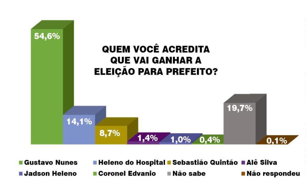 Quando perguntados sobre quem o eleitor acredita que vencerá a eleição, independentemente da sua escolha, 54,6% responderam Gustavo Nunes. Para 14,11% Heleno do Hospital será o vencedor, para 8,7% o ganhador será Sebastião Quintão e apenas 1,4% respondeu Alê Silva e 1% Jadson.Dados socioeconômicos do eleitorado entrevistado