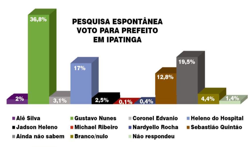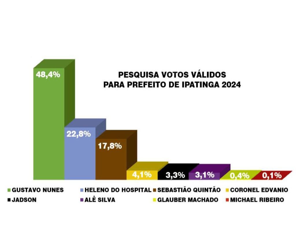 Candidato à reeleição, Gustavo Nunes (PL) lidera a intenção de votos para prefeito de Ipatinga, com uma margem considerável à frente dos demais candidatos. A pesquisa, sob o número de registro MG-04461/2024, teve dados coletados junto aos eleitores entre os dias 27 de setembro e 2 de outubro de 2024, tem margem de erro de 2,76% para mais ou para menos, com nível de confiança de 95%.