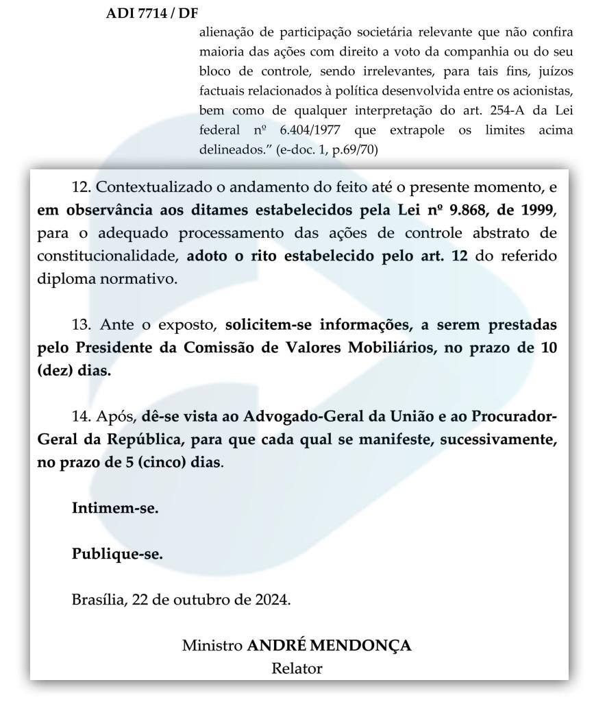 O ministro André Mendonça acatou a Ação Direta de Inconstitucionalidade (ADI) e pede esclarecimento para CVM sobre regras de OPA