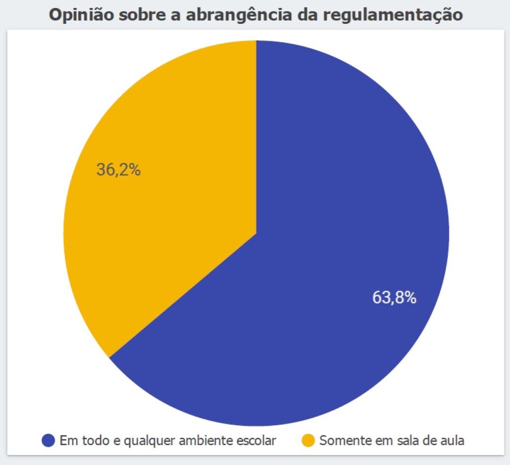 Outra pergunta feita pela enquete foi sobre como e onde deve ocorrer a regulamentação do uso de celulares, um tema divergente entre os educadores. Entretanto, a maioria, 63,8% defende que a regulamentação ou proibição do uso de celulares deve ser aplicada em todo o ambiente escolar, abrangendo desde as salas de aula até outros espaços. Já 36,2% acreditam que a regulamentação deve ser restrita apenas às salas de aula, permitindo maior flexibilidade no restante do ambiente escolar.