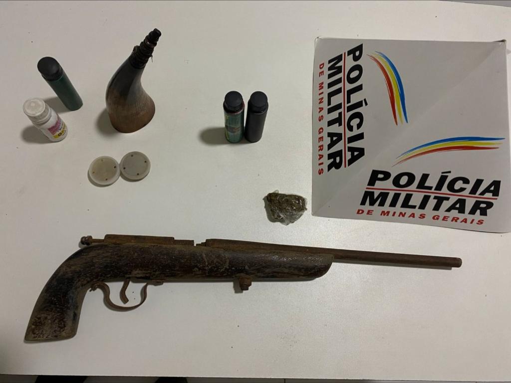Em buscas feitas no caminho por onde ele tentou escapar, foi encontrada uma cartucheira artesanal. Na residência, em uma sacola azul, foram localizados recipientes com pólvora, chumbo e espoletas. A busca na casa foi autorizada e acompanhada por uma testemunha.