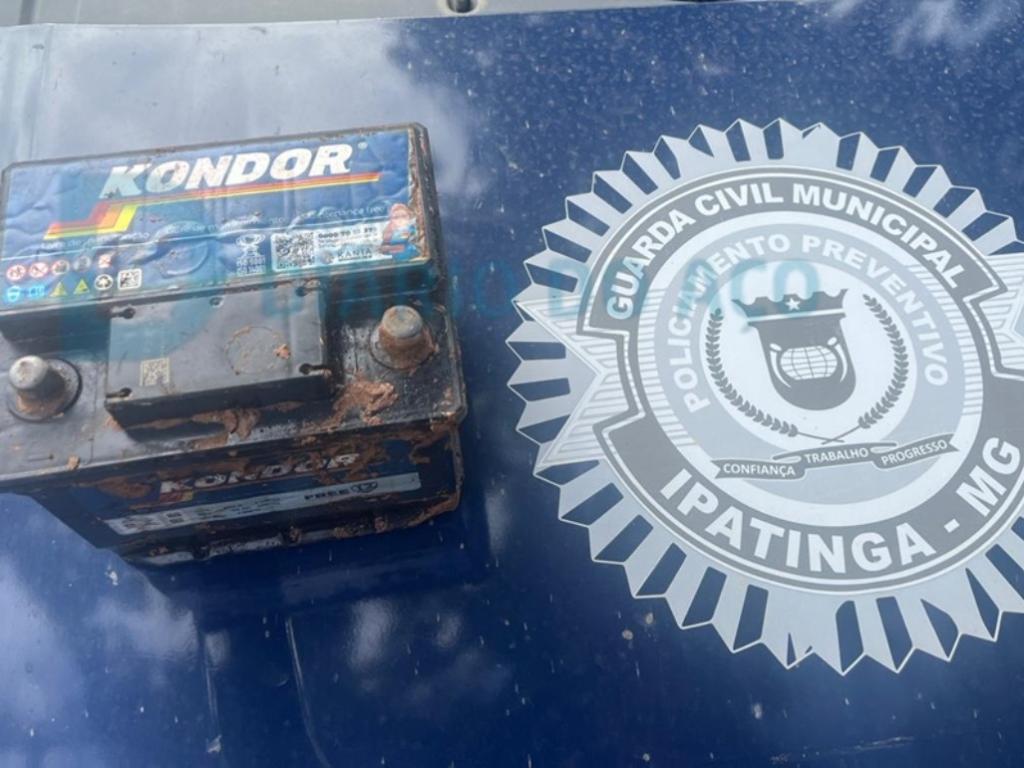 A bateria encontrada em poder dos dois jovens abordados pelos guardas civis municipaisOs agentes da Guarda Civil Municipal (GCM) de Ipatinga prenderam na tarde de segunda-feira (13) dois jovens durante patrulhamento na região central da cidade. A abordagem ocorreu após um solicitante informar aos guardas sobre o furto da uma bateria de um VW Virtus TSE 2022, com placas de Ipatinga, que havia sido arrastado devido ao temporal do último domingo (12), ficando submerso embaixo de uma ponte na avenida Macapá, no bairro Veneza II.