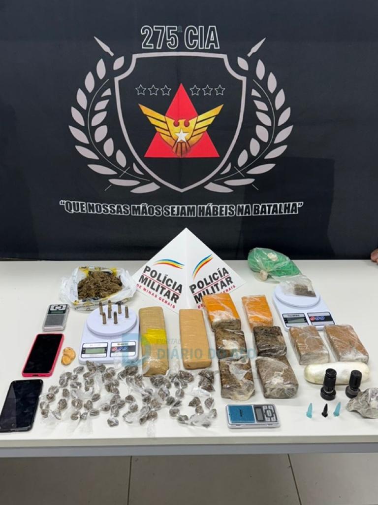 Durante a abordagem, foram apreendidos 67 buchas de maconha, porções de cocaína, munições de calibres 38 e 9 mm, além de materiais utilizados para o fracionamento e embalagem de drogas, como sacolas plásticas e balanças de precisão.