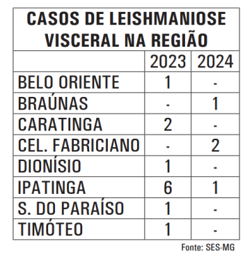 No ano passado, os casos de leishmaniose visceral caíram no Vale do Aço. Em 2023, a região havia registrado 12 ocorrências, porém, em 2024, foram apenas quatro notificações. Os dados são do painel de vigilância em saúde, da Secretaria de Estado de Saúde de Minas Gerais (SES-MG), analisados pela reportagem do Diário do Aço.Os municípios que relataram os casos da doença foram Braúnas, Ipatinga e Coronel Fabriciano. A zona de ocorrência dos quatro acontecimentos foi a urbana e os infectados são homens entre 20 e 39 anos e 50 a 59 anos. No ano anterior, em 2023, houve 12 relatos de leishmaniose visceral na região, e o município que mais registrou infecções foi Ipatinga, seguido por Caratinga, Belo Oriente, Dionísio, Santana do Paraíso e Timóteo. Os dados completos estão na tabela que acompanha esta reportagem.