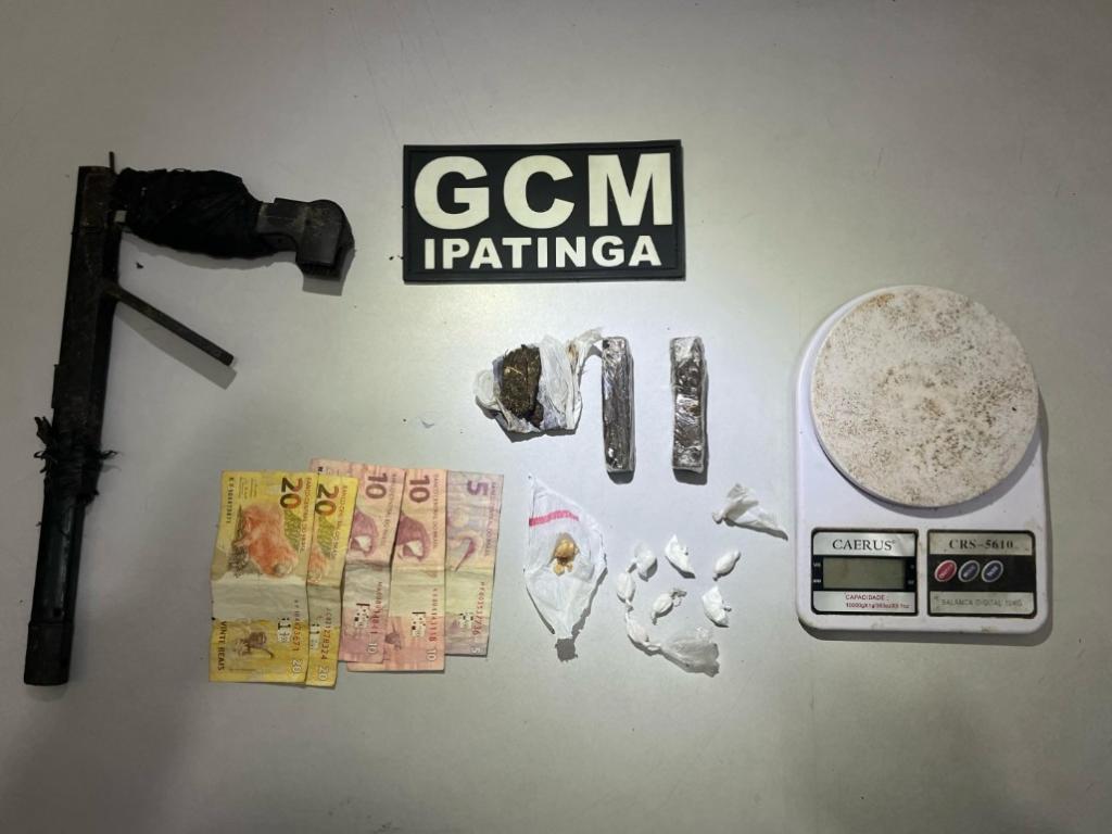 Durante a abordagem e busca pessoal, os agentes encontraram, ao lado dele, uma arma de fogo de fabricação artesanal. Na pochete que ele carregava, foram apreendidas uma pedra bruta e invólucros com porções fracionadas de crack, três buchas de maconha, sete papelotes de cocaína, uma balança de precisão e a quantia de R$ 65,00.