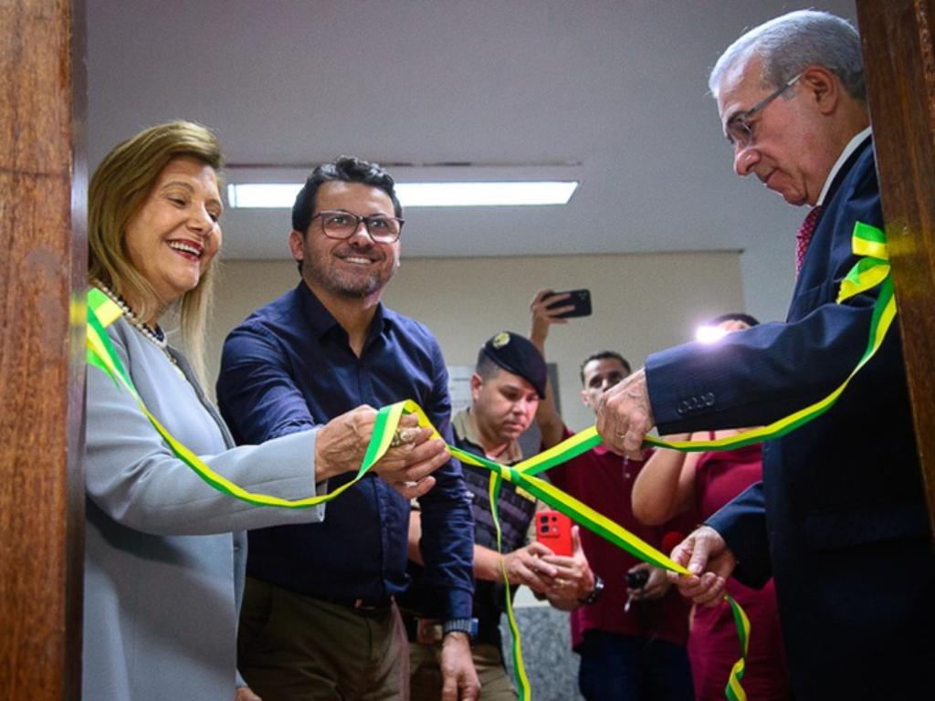 Presidente do TRT-MG, desembargadora Denise Alves Horta; o secretário de Governança Política da Prefeitura de Coronel Fabriciano, José Márcio Gomes Pereira; e o 1º vice-presidente do TRT-MG, desembargador Sebastião Geraldo de Oliveira cortam fita simbólica para marcar inauguração da nova unidade do Cejusc