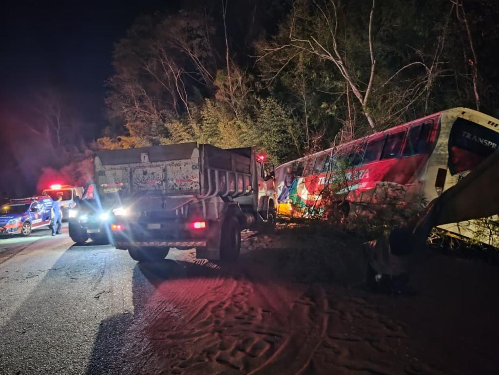 Já o condutor do ônibus, A.L.M., de 45 anos, afirmou que seguia normalmente pela via e, ao contornar a curva, foi atingido pela carreta que tombava, o que arremessou o coletivo para fora da pista. No momento do acidente, havia 12 passageiros a bordo.