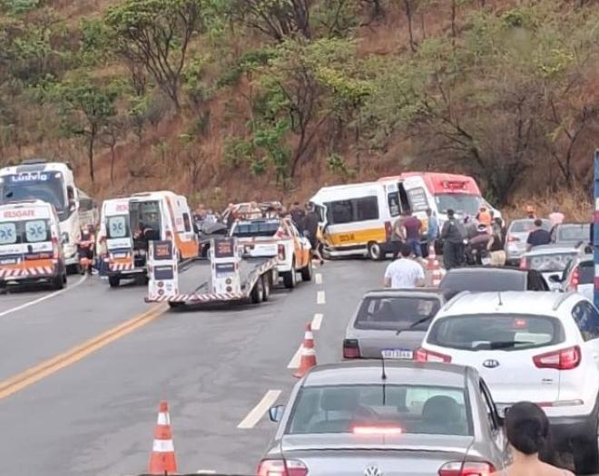 Um acidente de trânsito envolvendo uma van escolar e um carro na BR-381, em Caeté, provocou a interdição total da via, no km 423, sentido Belo Horizonte, próximo ao s” das bananas, local com curvas acentuadas. As informações iniciais apontam que ao menos quatro pessoas ficaram feridas na colisão, ocorrida na tarde deste domingo (12). De acordo a Polícia Rodoviária Federal, o trânsito ainda está interrompido.