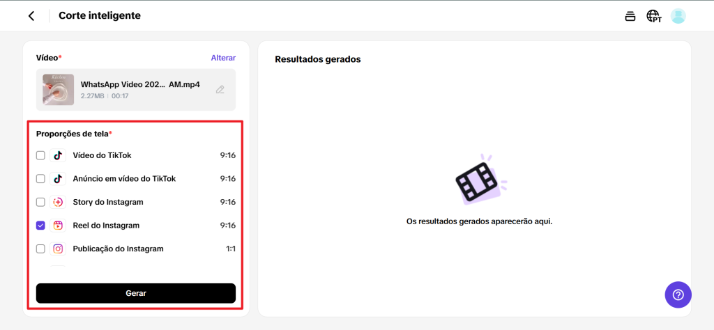 Importe os vídeos do seu dispositivo ou da nuvem. Selecione as proporções necessárias, clique em "Gerar" e deixe a IA automatizar o corte. Faça uma prévia antes de finalizar para garantir precisão.