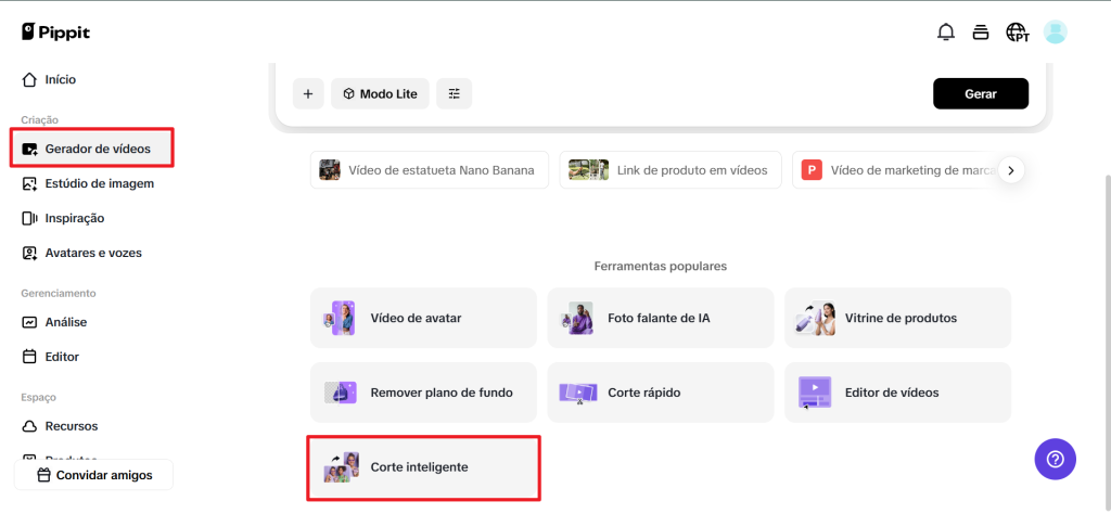 Clique no botão "Experimente grátis" abaixo para se registrar no Pippit com o modo de sua preferência. Isso garante uma integração simples para todos os usuários. Tenha acesso imediato às ferramentas de edição perfeitas. No painel do Pippit, clique em "Gerador de vídeos" e escolha "Corte inteligente".