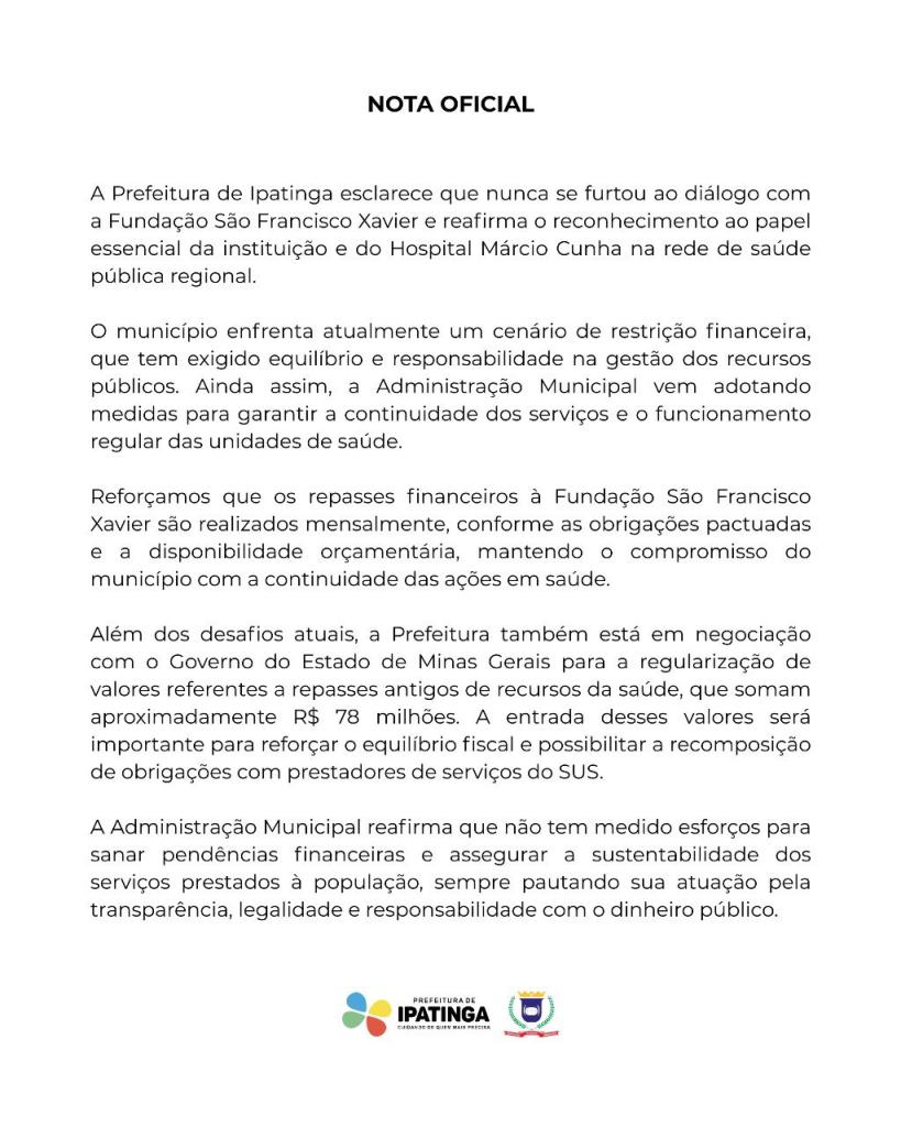 saúde. Ressaltamos que as diretorias da FSFX e HMC tentaram de todas as formas buscar diálogo com a Prefeitura de Ipatinga, buscando a quitação dos débitos existentes e a construção de soluções que garantam a continuidade dos serviços à comunidade, porém não obteve êxito”.