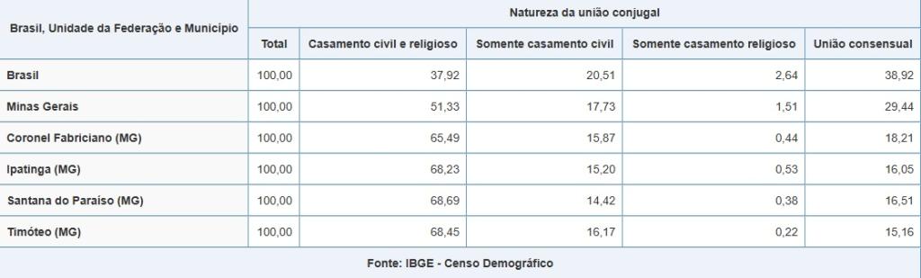 Em Ipatinga são 73.243 (68,23%) casais unidos pelo casamento religioso e civil; 16.317 (15,20%) apenas pelo casamento no civil; 564 (0,53%) que casaram apenas no religioso e 17.227 (16,05%) em união consensual.