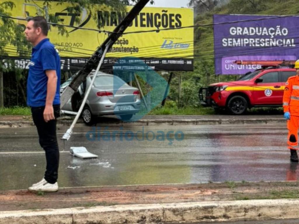 Carro se choca contra poste de energia elétrica em Coronel Fabriciano