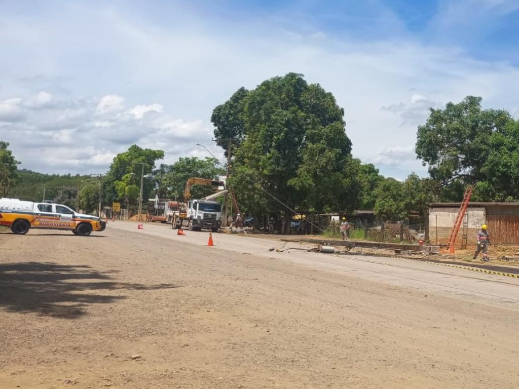 Diante do risco de acidentes, os policiais isolaram a área e orientaram o tráfego, que passou a seguir por um acostamento amplo existente no trecho. A estrutura danificada puxou outros quatro postes, que também tiveram suas bases comprometidas e necessitaram de reparos emergenciais.