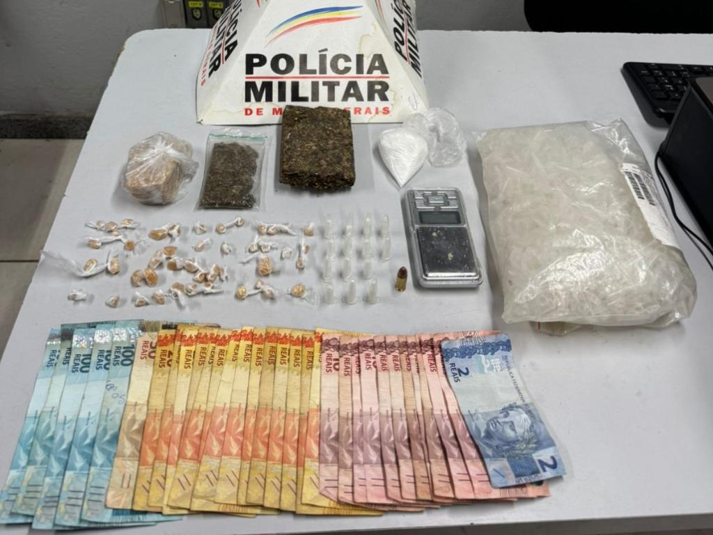 Com a autorização do morador, os militares entraram na residência e encontraram três pessoas. No quarto usado pelo suspeito, foram localizadas porções de crack, cocaína e maconha, além de recipientes para armazenar os entorpecentes, materiais de preparo, uma balança de precisão, uma munição calibre 9 milímetros e dinheiro.