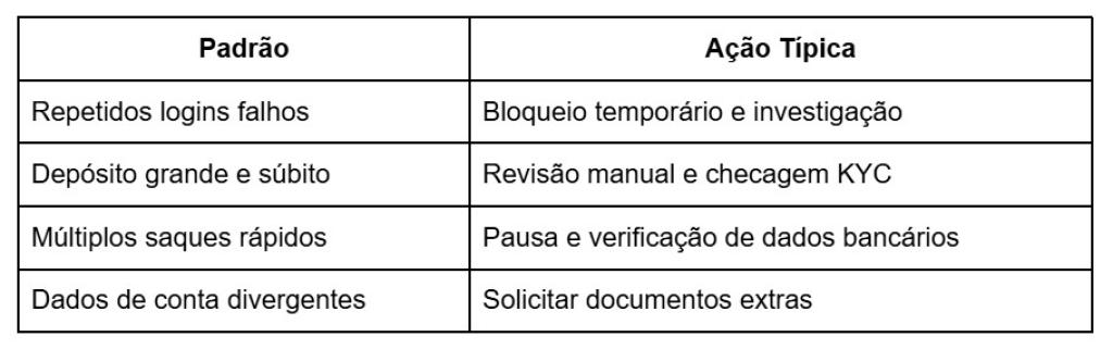 A plataforma monitora depósitos e saques em busca de padrões estranhos. Ela sinaliza logins repetidos falhos, depósitos grandes súbitos e rotas de saque atípicas. A equipe de segurança revisa casos e pausa transações que correspondam a perfis de risco.Uma tabela curta abaixo lista padrões monitorados e a ação típica que a plataforma toma.